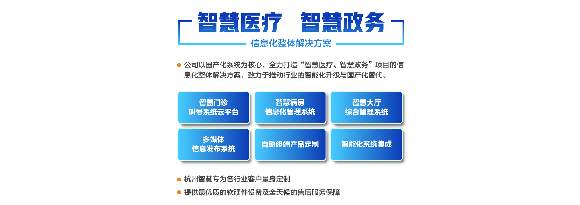 杭州智慧科技有限公司初創(chuàng)于2003年,總部位于重要的電子商務(wù)中心中國(guó)杭州公司主營(yíng)業(yè)務(wù)有:智慧分診叫號(hào)系統(tǒng)、智慧病房醫(yī)護(hù)對(duì)講系統(tǒng)、智慧大廳綜合管理系統(tǒng)、智慧政務(wù)管理系統(tǒng)、智慧多媒體信息發(fā)布系統(tǒng)、導(dǎo)診系統(tǒng)及各自助終端產(chǎn)品定制。專為各行業(yè)客戶量身定制。公司已有20余年行業(yè)經(jīng)驗(yàn)沉淀積累,擁有優(yōu)秀的產(chǎn)品外觀設(shè)計(jì)師和各類中高級(jí)專業(yè)技術(shù)工程師,確保所研發(fā)的產(chǎn)品具有行業(yè)領(lǐng)先的外觀及可靠的技術(shù)性能。并擁有權(quán)威部門頒發(fā)的各類知識(shí)產(chǎn)權(quán)及專利證書(shū),30多項(xiàng)資質(zhì)證書(shū)、800多個(gè)合作伙伴、2000多個(gè)項(xiàng)目成功案例經(jīng)驗(yàn)。 智慧產(chǎn)品已遍及全國(guó)各醫(yī)療、政務(wù)、金融、通訊、公安、工商、稅務(wù)等行業(yè),形成以“立足杭州、輻射長(zhǎng)三角、拓展全國(guó)”的戰(zhàn)略發(fā)展格局,產(chǎn)品經(jīng)過(guò)歷年不斷創(chuàng)新,形成專業(yè)化、平臺(tái)化,致力于成為智慧產(chǎn)品的領(lǐng)軍企業(yè)。 公司建立了完善的技術(shù)培訓(xùn)及售后服務(wù)中心,并設(shè)24小時(shí)熱線咨詢電話解答用戶反饋的問(wèn)題。同時(shí)應(yīng)客戶要求定期派技術(shù)人員到 全國(guó)各地進(jìn)行技術(shù)指導(dǎo)輔助用戶正確使用智慧產(chǎn)品并能獨(dú)立安裝、調(diào)試、日常維護(hù)等工作。提供最優(yōu)質(zhì)的設(shè)備及全天候的售后服務(wù)保障,智慧永恒不變的服務(wù)宗旨——致力于客戶的滿意與成功!...